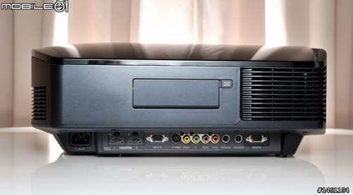 所有VW85的端子介面跟选单按键,电源线插孔等都设计在同一侧,图上可以看到电源线插孔设计在最左下方,最下方那一排就是VW85支援的所有输出入讯源与控制端子连接的地方,由左至右分别是HDMI(1.3a) 输入X2,INPUT A(D-SUB)X1,S-VIDEO输入X1,AV输入X1,色差端子输入X1组,TRIGGER端子X2,RS232端子X1,以家用的需求来看,在输入与控制的端子种类上算是相当完整。上面的选单按键是附有防尘盖的,不使用时关起来就好。