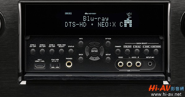 打开盖板,正中央是十字方向键与输入键的多功能操作组合,上部左右两侧分别為多区及讯源快速选择切换,左下角有HDMI输入、对应iPod可充电的USB端子与耳机输出插孔,右下角则有一组同轴影音输入与Audyssey音场测试麦克风插孔。左下角这组HDMI端子除了方便连结游戏机、数位相机之外,也支援新款Android智慧型手机的MHL连接,可将手机内的影音档案送至本机在整套AV系统播放。