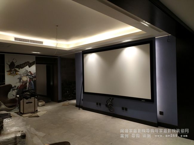 后部的墙面很有感觉,特别说明的是投影机的选择是临时用的业主自己买的一款互联网品牌极米投影机,后期肯定需要更换!别看东西很小,但安装难度一点都不小,本身设计就不是一款吊装的专业家庭影院投影机,阿强费了好大功夫才安装上,然电源实在无法安放只能挂在吊架上了!