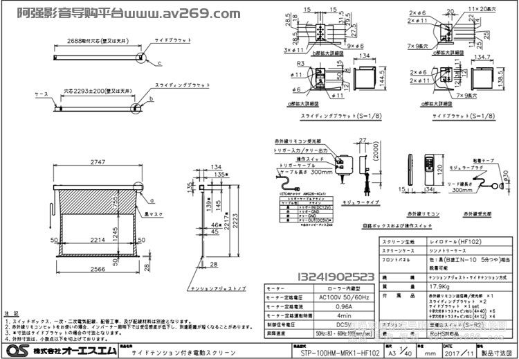 OS STP-150HM-MRK1-WS103 OS电动拉线幕 150英寸16:9 WS103透声幕料