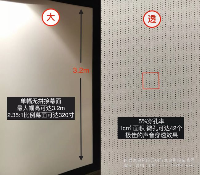 3、大尺寸:单幅无拼接幕面,最大幅高可达3.2m,2.35:1比例尺寸可达320寸;