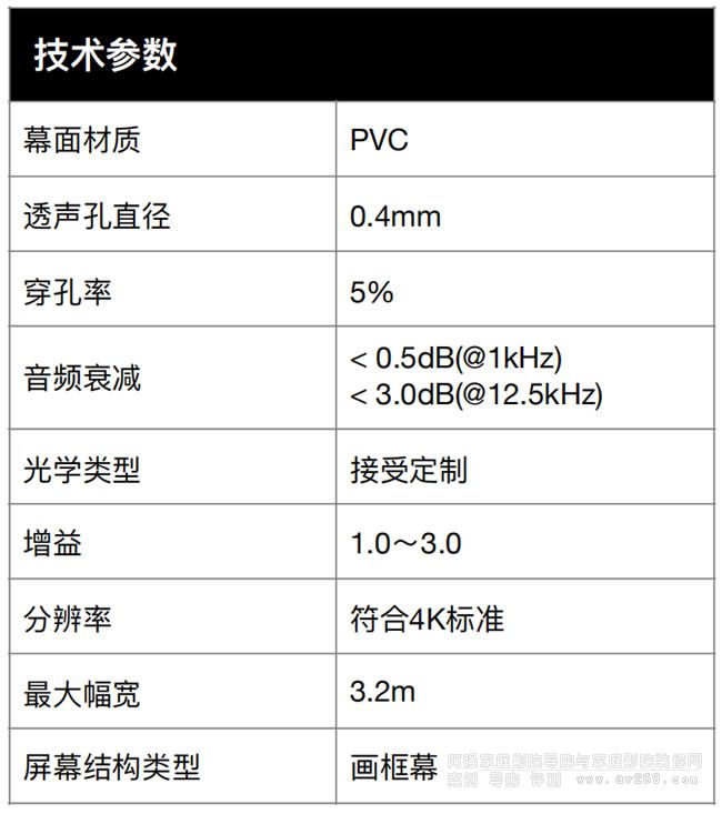 焦点微孔透声幕布MP 系列微孔透声幕,是针对中高端私人影院系统推出的可透声投影屏幕,银幕表面布满透声微孔,微孔直径仅为 0.4mm,采用目前全球最尖端的加工技术制造而成, 2⽶以外孔迹不可见,大大增加了观影范围。穿孔率约为5%,⾼保真的声音穿透效果。幕面每个微孔的面积仅为 0.125mm²,以 150” 16:9屏幕为例,微孔面积仅为 1080P 每个像素的 4%,即使采用4K 分辨率的投影机,其微孔面积也仅为每个像素面积的 17%,因此 MP 系列透声屏幕,可以充分满⾜ 4K 投影机的显示需求。此款屏幕也被某顶级院线公司选中作为其在线影院系统的配套屏幕。