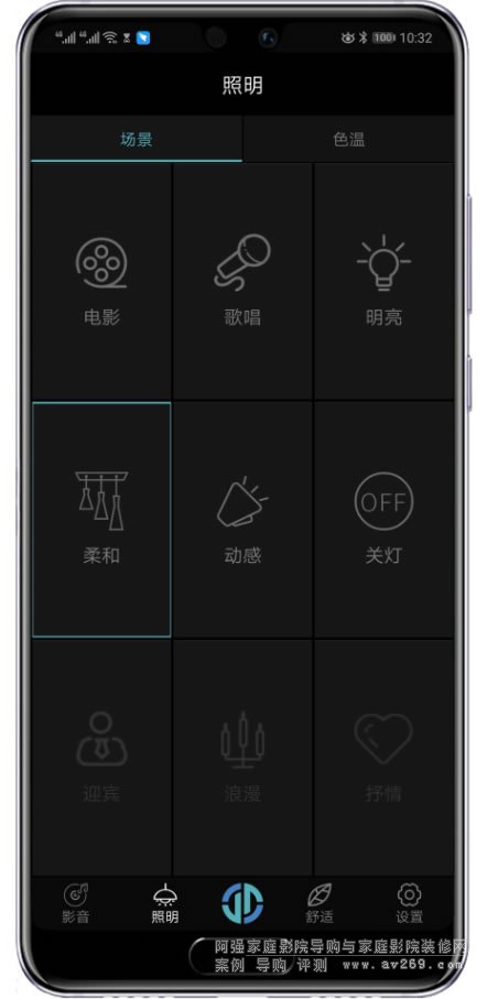 灯光控制界面我觉得没什么好讲的,就是有9个模式,先预设好,给用户就是一键切换,当然也是可以和观影/KTV的场景模式联动,看你喜欢了。有人问这么多灯光模式有用吗?呵呵,当你只有两个模式的时候肯定不够用吧,多几个可以千变万化啊,况且现在调光、调色那么流行。