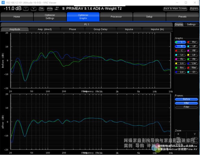 在Altitude16取得三度空间响应的精密测试数据之后,接下来就要作优化,这也正是Trinnov技术的精华所在。Trinnov Optimizer不只能作精细的频率响应校正、距离(延迟时间)校正、各声道喇叭与各音路相位一致性的修正,还能改善脉衝响应、使全系统能确实表现出优异的暂态特性,还能使初期反射音获得控制、Room Mode的影响大幅降低。所有声道喇叭实测的响应状况(before)与优化后的结果(after)全部都明确地以图表显示,从频率响应曲线观察,就能看出响应变得非常平坦,并且各声道喇叭的频率响应曲线也趋于一致。
