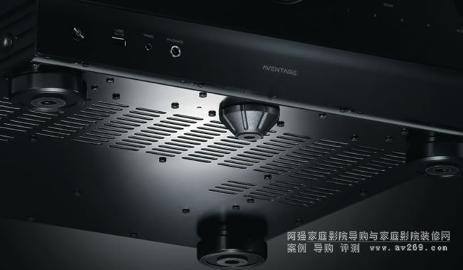 ▲AVENTAGE系列的机箱非常重视抑振结构,翻到机箱底部会发现RX-A6A除了四支的粗壮的脚座支撑外,面板正下方还用上了“第五隻脚”,原厂将其名为“A.R.T.抗振脚座”。因为原厂发现变压器的底部,是环扩振动最大的地方,所以这个A.R.T.抗振脚座的安装也是透过的科学仪器实测,经过不断尝试后才决定设在“中央前方”靠近面板的位置,可做为机箱的“机械接地”让机底减少约九成的振动,大幅降低机箱振动对音质产生的不良影响。实际听起来会提升低频段的纯淨度,强化细节表现,减少氾滥能量产生