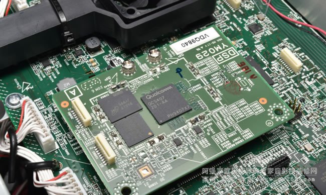 ▲从RX-A6A的音讯处理的部分採用独立的电路板,搭载一枚Qualcomm Qcs407 四核心的DSP晶片,处理效能是过去的七倍,可以处理64bit的Surround AI以及YPAO音场校正功能。接著採用一枚8声道的ESS ES9026Pro DAC晶片负责主要声道,再用一枚次一级的ESS ES9007晶片(A8A採用ES9026Pro晶片)负责附属声道的解码