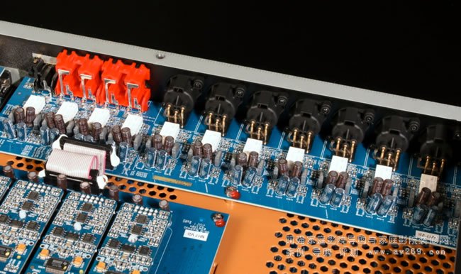 后方这长条形的电路板,就是本机下层8组声道输出的平衡与非平衡输出电路板,每组输出都有继电器开关连接。