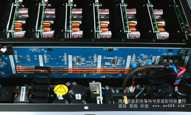 七个功率放大模组插槽的供电,并非透过电路板薄薄的铜箔或细细的电线传输,而是由左至右横跨电路板上方平行的三片铜金属板,确保所需的大电流能够顺畅流通传递。