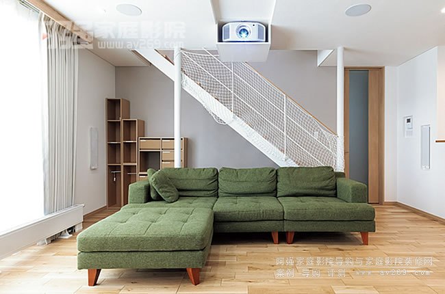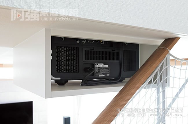 投影机安装位置也是这个空间的一个亮点,没有采用常规的吊装,而是给投影机做了一个小房子,巧妙的安置了这款JVC投影机,根据投影机的散热特点做了特别优化,尾部的立板没有封,有利于散热的同时,接插线也更加方便。