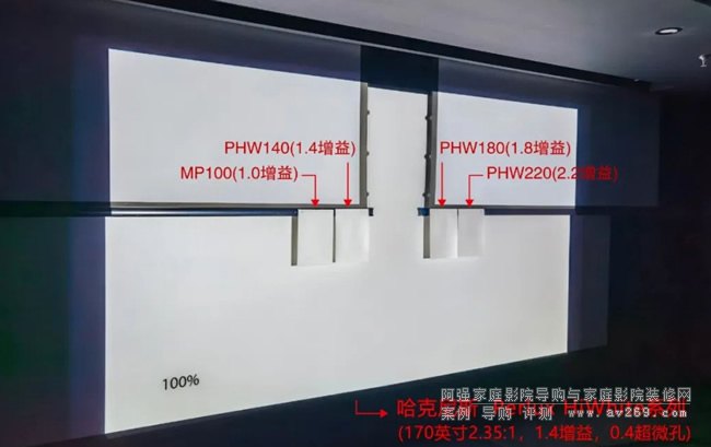 从实际测试来看,在偏离屏幕中心40°屏摄,PHW140的亮度有一定下降,跟1.0增益的MP100几乎一样;PHW180样幕偏离屏幕中心的角度更大(约50°),亮度略低于PHW140;PHW220由于偏离中心角度最大(约60°),同时由于高增益导致半增益视角较小,在侧向观看的亮度反而最低。这张屏摄直观地展示了屏幕增益系数和视角的关系,为设计影院时的增益选择提供参考,各幕样基本符合harkness官方的可视角度数据。