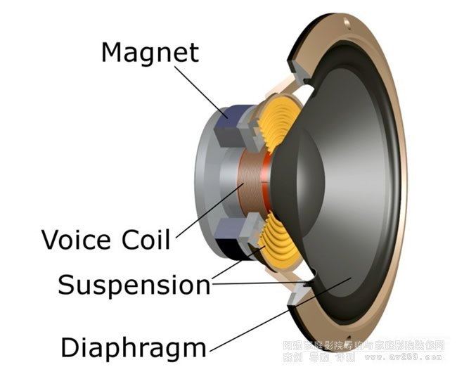 球顶扬声器和锥形扬声器都属于电动式扬声器。电动式扬声器的原理就是把线圈放在磁场里,再接入交流电,线圈就会在磁场里产生前后往返运动。至于为什么会产生前后往返运动,请自行翻阅中学物理课本里面的“左手定则”和“右手定则”。当然,真正的扬声器还会复杂一点,还有磁铁、导磁板、支架(也叫盆架)、振膜(也叫音盆)、折环(用于连接振膜与音盆)、定心支片(也称弹波)等零部件。