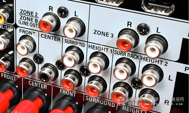 喇叭端子群上方右侧白色底色区域就是前级输出端子群,除了主区的11.2声道之外,还有ZONE 2与ZONE 3各自的立体声模拟音频输出。