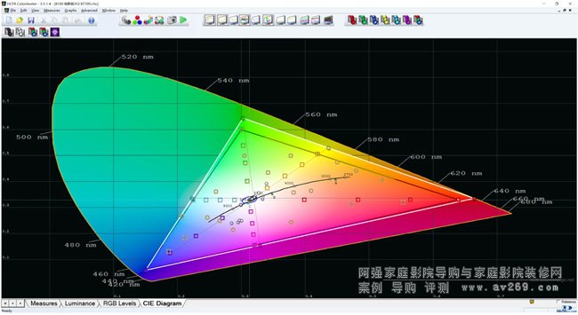 然后测量的另一个重点是色域覆盖,这里我设置的模式是电影胶片2,可以看到在BT.709模式下,索尼家用投影P9做到了完全覆盖,绿色部分甚至还有超出。而对于DCI-P3,它也达到非常高的覆盖率,从图中可以看到只有绿色稍微有些偏移。