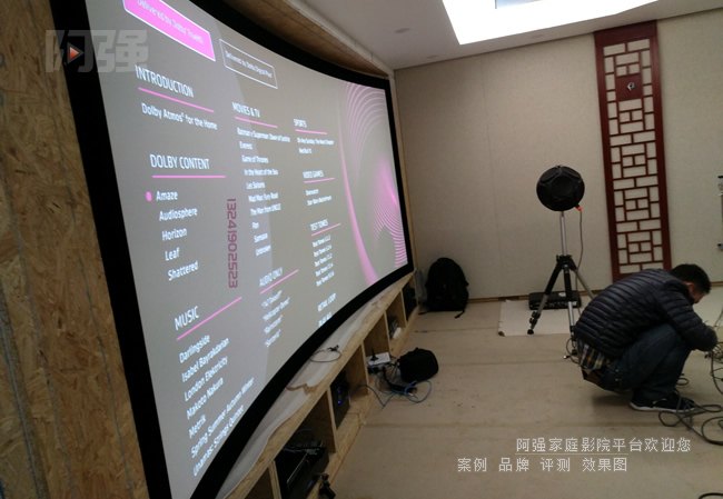 为应对声学与融合挑战,并满足客户对顶级视听体验的追求,采用弧形画框透声幕,即能保证声像合一,又能让室内更加简约,采用变形镜头的目的就是让画面包围感更强,同时留处一定的高度做嵌入式设备柜,整体装饰功能造型、声学处理与设备均巧妙的进行了融合,实现影音效果的最大化的同时现场舒适度得以提升。