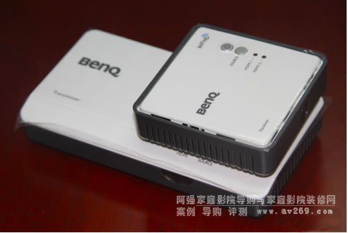 明基无线投影技术的配件是与机器分开安放,接收器盒子是一个正方形,而发射器则是长方形,两个盒子重量非常轻,小巧的体积,使得发射器在摆放时可以很好的隐藏,不会占据太大空间。