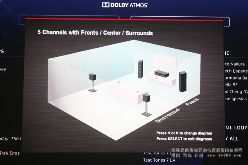 我们重点来看看天空声道的设置,这张图我们看到天空上有六个喇叭,但并不是说它支持六个天空声道,而是指这台MA X1120可以使用2个或者4个天空声道,图片说明了安装天空声道的大致位置。av269.com阿强家庭影院导购平台
