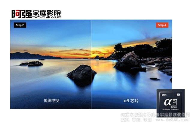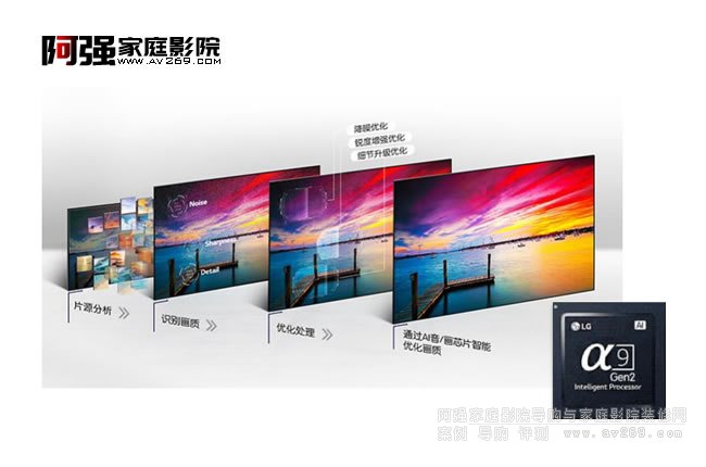LG专为OLED电视自主研发的人工智能画质引擎 α9 Gen2芯片,四重降噪技术,第一、第二阶段消除画面噪点和波纹,第三、第四阶段抹去色带和瑕疵,画面表现更加清晰自然