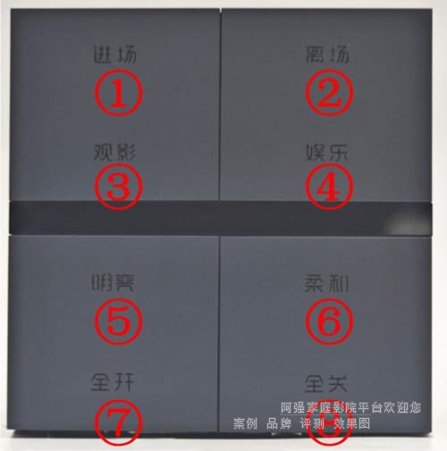 模式三: 长按③号“观影”, ⑦⑧“全开/全关”为面板继电器的全部打开/关闭,其余按键为场景按键,需在调试软件添加场景上定义功能。
