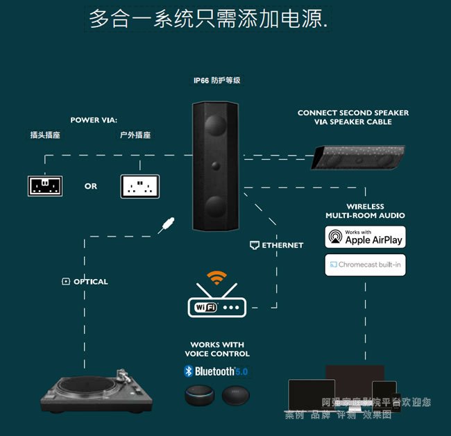 多合一扬声器从您的照明电路或任何主电源馈电中获取电力。