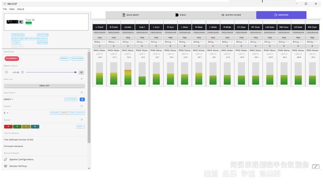 Tide16 根据扬声器布局和 Atmos/DTS:X 内容,最多可从 HDMI 解码 16 个通道。它提供三个HDMI输入端口和eARC(增强音频回传通道),用于通过eARC电视传输的音频源。在扬声器处理的核心领域,miniDSP 再次与 Dirac Research 合作,免费提供 Dirac Live(RC)、低音校正(BC)和主动房间处理(ART)授权。灵活矩阵混音器、先进的低音管理和miniDSP的完整处理套件在所有十六个输出端运行,简化了多重低音炮、主动扬声器或多扬声器录音室配置的设置。