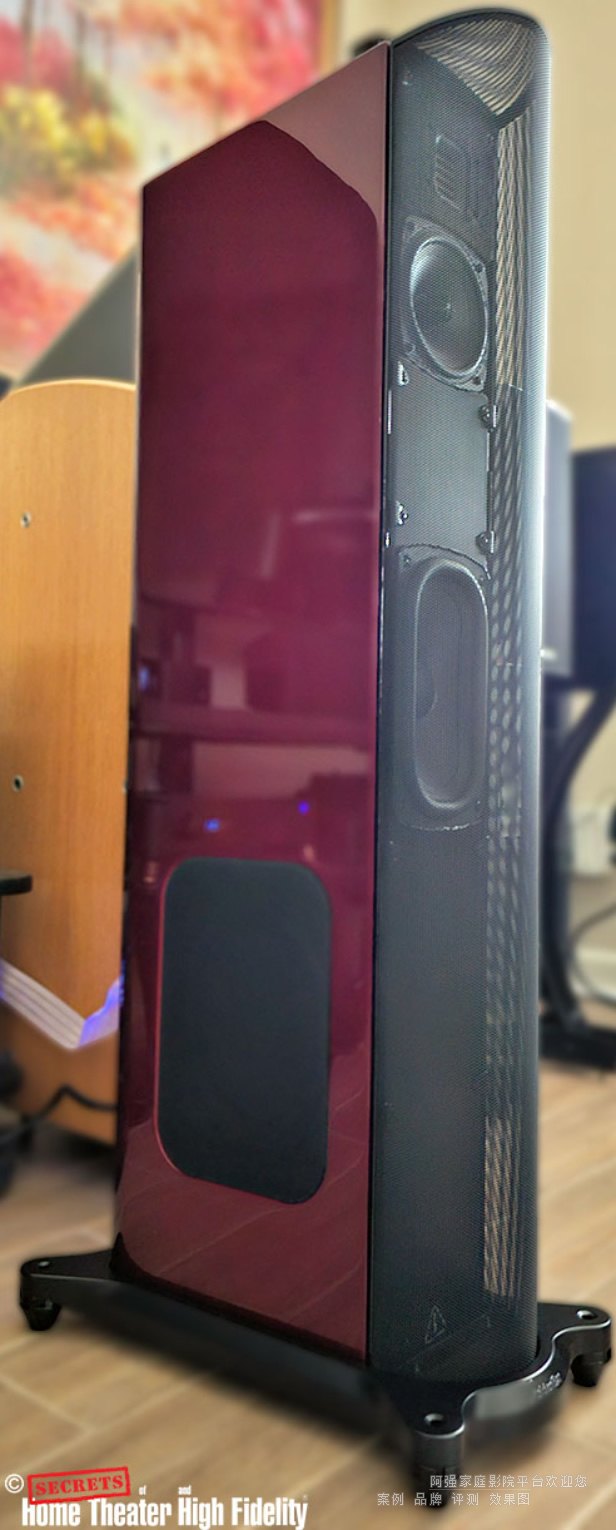 GoldenEar T44扬声器属于落地式扬声器中较为紧凑的一端,高约40英寸,外形纤薄且节省空间。其狭窄的前挡板进一步强调了简洁流线型的轮廓,非常适合空间需求较大的应用。机柜采用优雅弧形的顶部和后面板,并由全尺寸铸铝底座支撑,底座配有金属脚锥,可通过内置可调节尖刺或橡胶尖端进行调整。这个底座不仅提升了视觉上的精致度,也增强了扬声器的机械稳定性。设计上不可拆卸的弧形穿孔铝制格栅构成了外壳的整体部分,并与整体几何造型相得益彰。制造质量令人信服,内饰为惰性,显示出内部支撑坚固。高光泽漆面极佳,尤其是圣巴巴拉红选项极为醒目——为整体设计增添了独特的精致感和视觉冲击力。