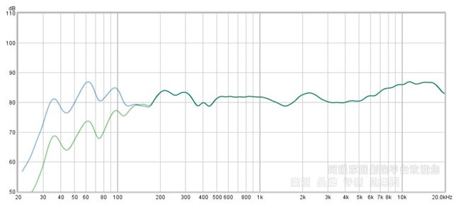 GoldenEar T44扬声器近场(2英尺)频率响应,低音炮关闭(绿色曲线),低音炮中频开启(蓝色曲线)。