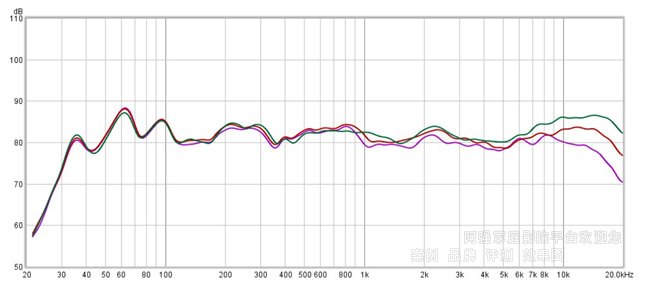 GoldenEar T44扬声器在30度(红曲)和45度(紫曲)角下,近场(2英尺)频率响应轴(绿色曲线)和水平偏离轴的比较