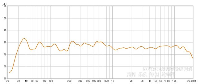 GoldenEar T44扬声器在听音位置的频率响应,中档设置开启低音炮,且无前置音。