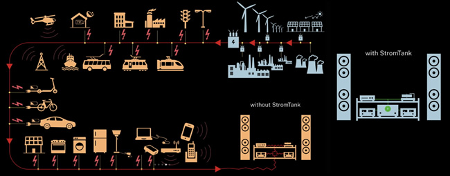 以电池供应电力给音响系统是异于任何电源处理器、滤波器、再生器的使用逻辑,电力在此以新生状态根据设计提供完美稳定的电压和周波频率给每一件音响器材使用,器材将不再受到市电不稳定与噪声的牵制。 Stromtank的供电逻辑是将市电存储于电池当中,当音响器材启动后,储存的电力经由电流转换器还原为完美干净的交流电后供应给连接的音响器材。 在运作过程中Stromtank可与市电断开,甚至将充电使用的电源线拔除,100%不受市电噪声污染,储备电力低档时再由市电充电即可,看起来就像手机供电系统一样。 并且也可边充电边聆听,此时主要由市电供应器材,而Stromtank会进行监控市电供应状态,适时以电池供应补足不稳定的缺口,因此仍然会好过直接使用市电。 但最佳方式仍然是以全电池供电状态使用。