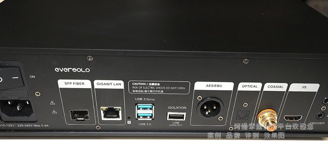 转向后面板,有一个IEC市电进气口和电源开关。两个网络端口(千兆和SFP光纤),或双频Wi-Fi,将T8连接到家庭网络。如果你用的是有线端口,设备也可以通过局域网唤醒开机。数字输出包括AES/EBU、TOSLINK光纤、同轴、通过HDMI的I2S和USB-A接口。Eversolo 还配备了 12V 触发输入和输出。唯一可能被遗漏的是外部时钟输入的配置。