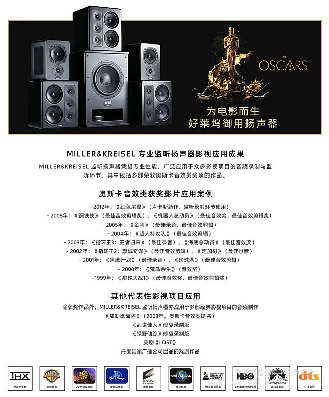 Miller & Kreisel 于 1974 年在美国比佛利山诞生,创始团队汇聚了 Jonas Miller 先生、Ken Kreisel 先生、Lester M. Field 博士及 Chuck Back 先生四位核心力量。凭借多项行业开创性技术,品牌成功奠定行业领先地位 —— 不仅发明了世界首款有源主动式分频超低音炮,打造出全球第一套卫星喇叭 + 超低音系统,更成为首家通过 THX 认证的音箱制造商。其核心技术被杜比、THX 广泛应用于多声道音效格式研发,成为行业技术标杆。五十余年来,Miller & Kreisel 音箱凭借低失真、高解析力的核心优势,还原极致真实的音质,不仅成为迪士尼、华纳、卢卡斯影业等顶级影视公司的指定监听设备,更深度覆盖专业音乐录音与高端家庭影院领域,在专业音频与消费级音频市场始终保持领导地位。