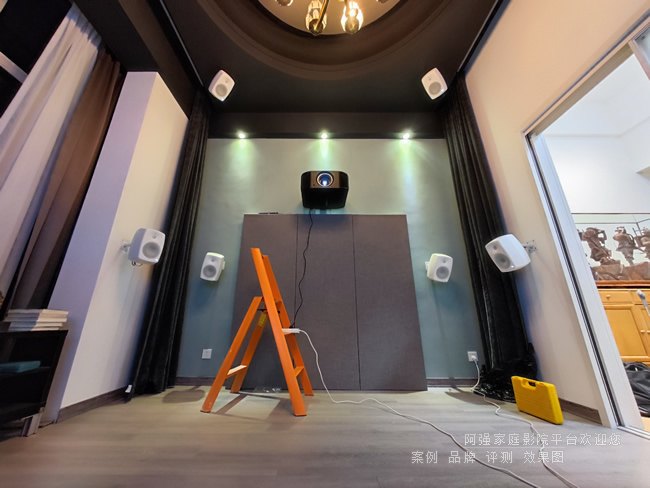 焦点画框透声幕布组装,由于客厅空间投距紧凑,采用约120英寸的画面,整个空间用的7.2.4声道的家庭影院音响系统,全部为真力有源音箱,使用马兰士前级来进行管控。