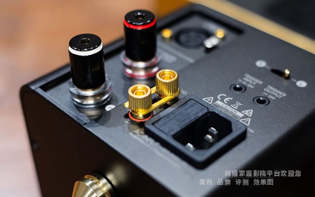Harmony GaNM的背面,具有XLR模拟输入x1,左右声道LED显示切换拨杆,机壳接地与喇叭输出端子