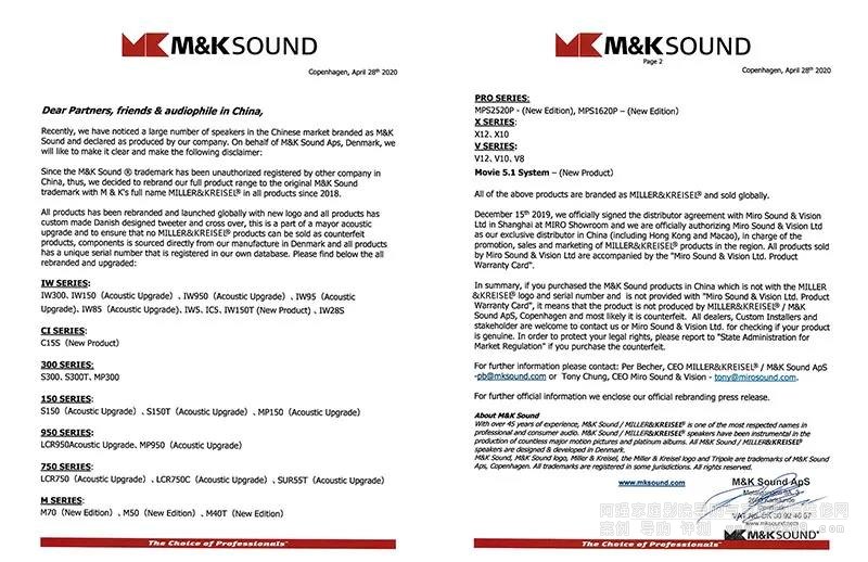 在中国旷日持久的版权争夺战,是将标志更改为Miller&Kreisel的另一个原因。我们希望每一位顾客放心,您购买到的本品牌的任何产品,都是值得信赖的产品。Miller&Kreisel标志的改变为我们提供了更多合法保护我们优质M&K Sound特性的方法。