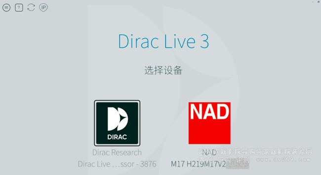 在与NAD M17 V2i同一区域网路的个人电脑等设备执行Dirac Live软体,就可搜寻到NAD M17 V2i(如上图右半部区块)开始进行量测调整,如果自动搜寻找不到,请点击画面左上角「IP」处输入NAD M17 V2i的IP位址(可在本机电视或投影画面选单的资讯栏内查到),即可找到并点击选择。