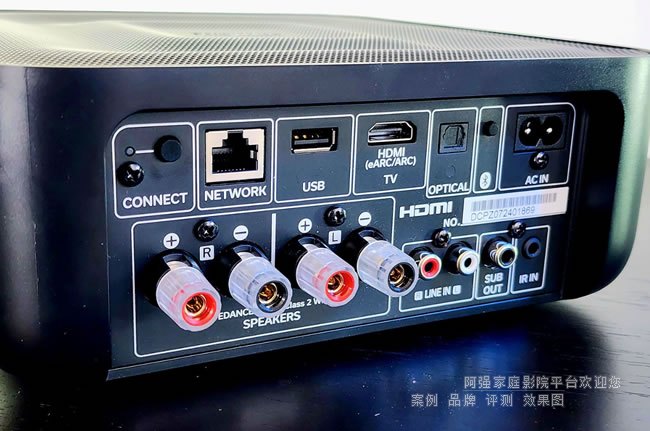 考虑到其紧凑的外形,Denon为家用功放赋予了令人惊讶的众多功能。制造商声称其Axign D类电源模块在8欧姆下每个通道可输出100瓦,4欧姆时可提升至125瓦。连接性广泛,物理输入包括光纤、HDMI eARC、RCA、USB和以太网。无线连接通过蓝牙或Wi-Fi 5。输出端有一个RCA低音炮输出和两个输出音频通道的扬声器端子。