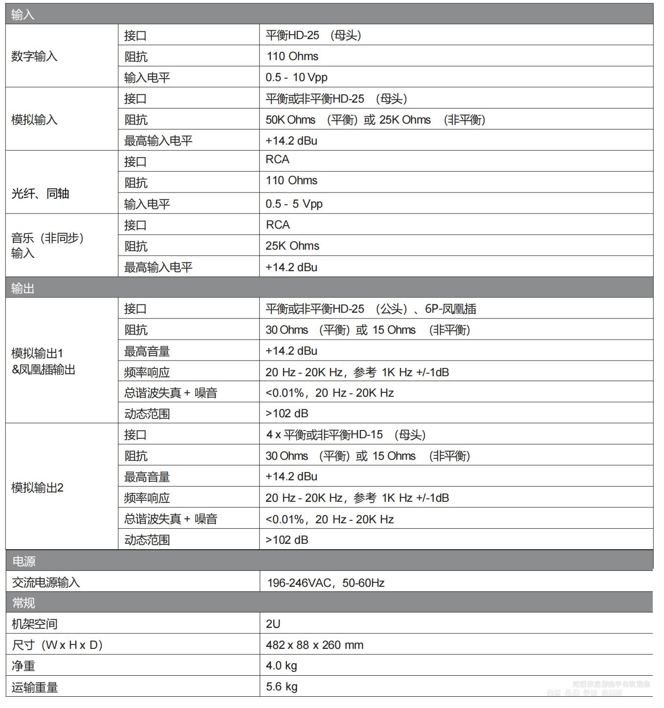数字输入【DIGITAL INPUT】:采用 HD-25 接口(母头),用于连接影音服务器,最高可输入 7.1 声道音频信号,支持 PCM 音频 @ 96、48、44.1、