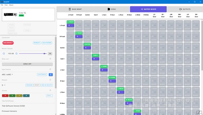 Tide16 根据扬声器布局和 Atmos/DTS:X 内容,最多可从 HDMI 解码 16 个通道。它提供三个HDMI输入端口和eARC(增强音频回传通道),用于通过eARC电视传输的音频源。在扬声器处理的核心领域,miniDSP 再次与 Dirac Research 合作,免费提供 Dirac Live(RC)、低音校正(BC)和主动房间处理(ART)授权。灵活矩阵混音器、先进的低音管理和miniDSP的完整处理套件在所有十六个输出端运行,简化了多重低音炮、主动扬声器或多扬声器录音室配置的设置。
