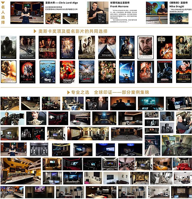 Miller & Kreisel 于 1974 年在美国比佛利山诞生,创始团队汇聚了 Jonas Miller 先生、Ken Kreisel 先生、Lester M. Field 博士及 Chuck Back 先生四位核心力量。凭借多项行业开创性技术,品牌成功奠定行业领先地位 —— 不仅发明了世界首款有源主动式分频超低音炮,打造出全球第一套卫星喇叭 + 超低音系统,更成为首家通过 THX 认证的音箱制造商。其核心技术被杜比、THX 广泛应用于多声道音效格式研发,成为行业技术标杆。五十余年来,Miller & Kreisel 音箱凭借低失真、高解析力的核心优势,还原极致真实的音质,不仅成为迪士尼、华纳、卢卡斯影业等顶级影视公司的指定监听设备,更深度覆盖专业音乐录音与高端家庭影院领域,在专业音频与消费级音频市场始终保持领导地位。