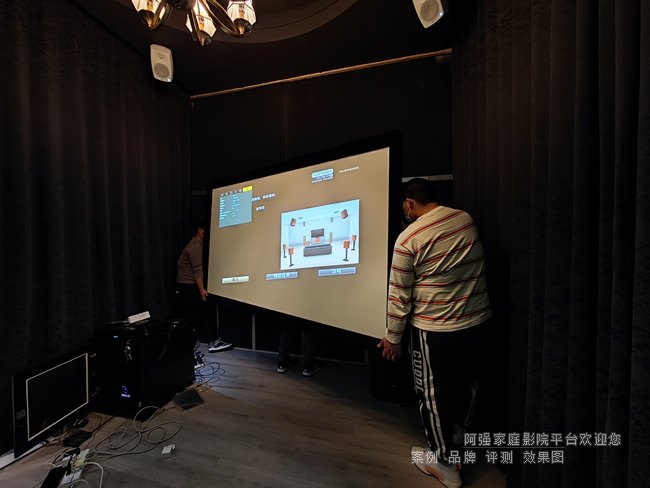 焦点画框透声幕布组装,由于客厅空间投距紧凑,采用约120英寸的画面,整个空间用的7.2.4声道的家庭影院音响系统,全部为真力有源音箱,使用马兰士前级来进行管控。