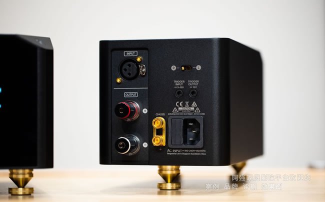 Harmony GaNM的背面,具有XLR模拟输入x1,左右声道LED显示切换拨杆,机壳接地与喇叭输出端子