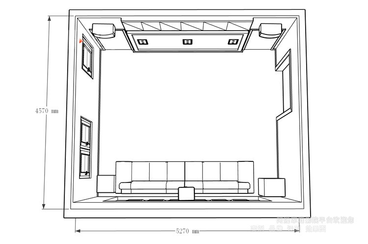 示意图上清晰显示着空间的先天缺陷:四面墙体,只有一个面是完整的。左侧前后分布着两个大小不一的窗户,右侧是一个1.6米宽的双开门入户门洞,前墙两侧各有一个门洞,分别通向设备间和保姆间,只有后墙完整。传统的落地式音箱、外摆式音箱,在这个空间里几乎无处安放。